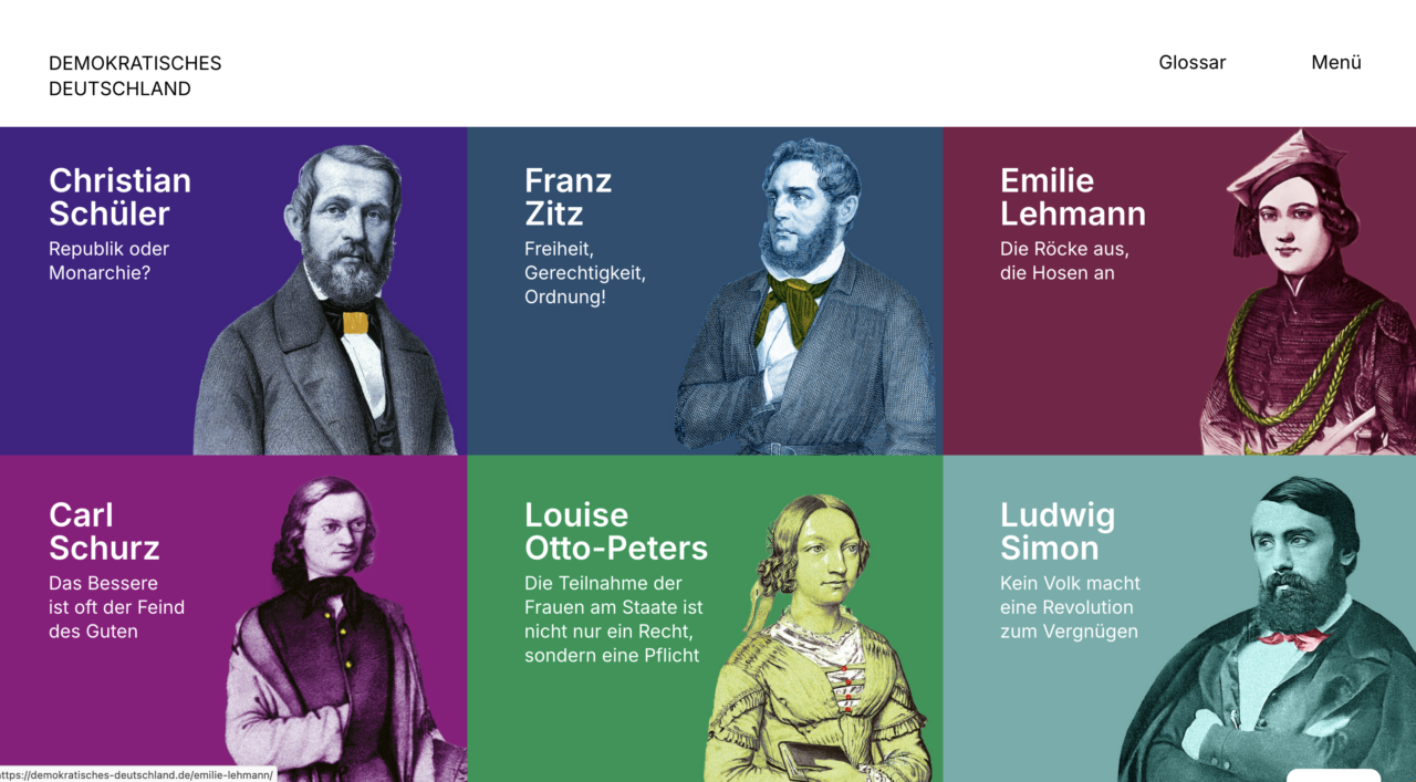 1848 ist lange her, aber wenn man in die Kurzbiografien der verlinkten Demokrat:innen eintaucht, ist das sehr lebendig, vor allem durch die beigefügten Briefwechsel. Bislang sind über 30 Personen vorgestellt und das Archiv wird weiterwachsen. Es entsteht in Kooperation mit der Stiftung „Orte der deutschen Demokratiegeschichte“, der Stadt Frankfurt, der Holtzbrinck-Publishing Group, dem Verlag Kiepenheuer & Witsch und dem Verein Demokratisches Deutschland e.V.
