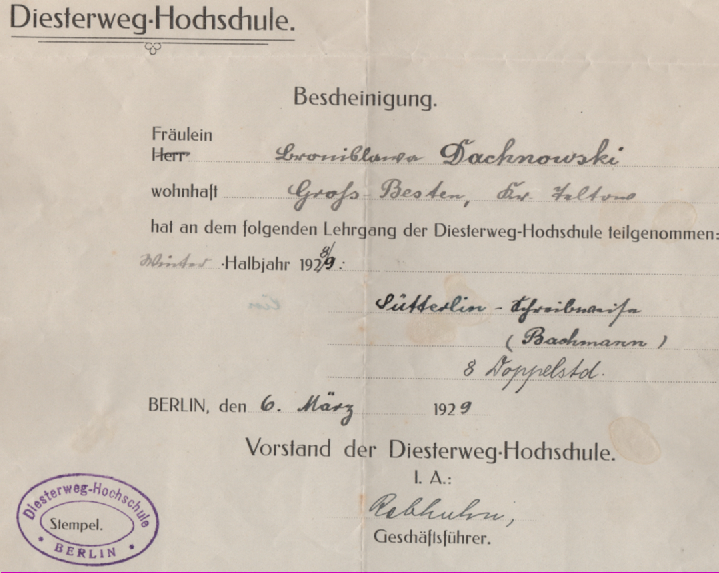 Das Dokument zeigt eine Bescheinigung über einen absolvierten Kurs der Diesterweg-Hochschule, und zwar in Sütterlin-Schreibschrift! Und am Spektakulärsten ist, dass es fast 100 Jahre alt ist – die Dame aus Groß-Besten hat im Halbjahr 1928/29 mit 8 Doppelstunden daran teilgenommen.