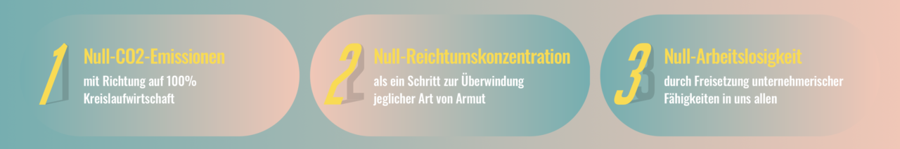Die Organisation 3ZERO, die von dem Friedensnobelpreisträger Muhammad Yunus ins Leben gerufen wurde, hat weltweit über 25.000 Changemakers, über 58 Unterorganisationen und sogenannte 3ZERO Clubs, die sich für die Umsetzung dieser Idee einsetzen: Null Emissionen – Null Armut – Null Arbeitslosigkeit