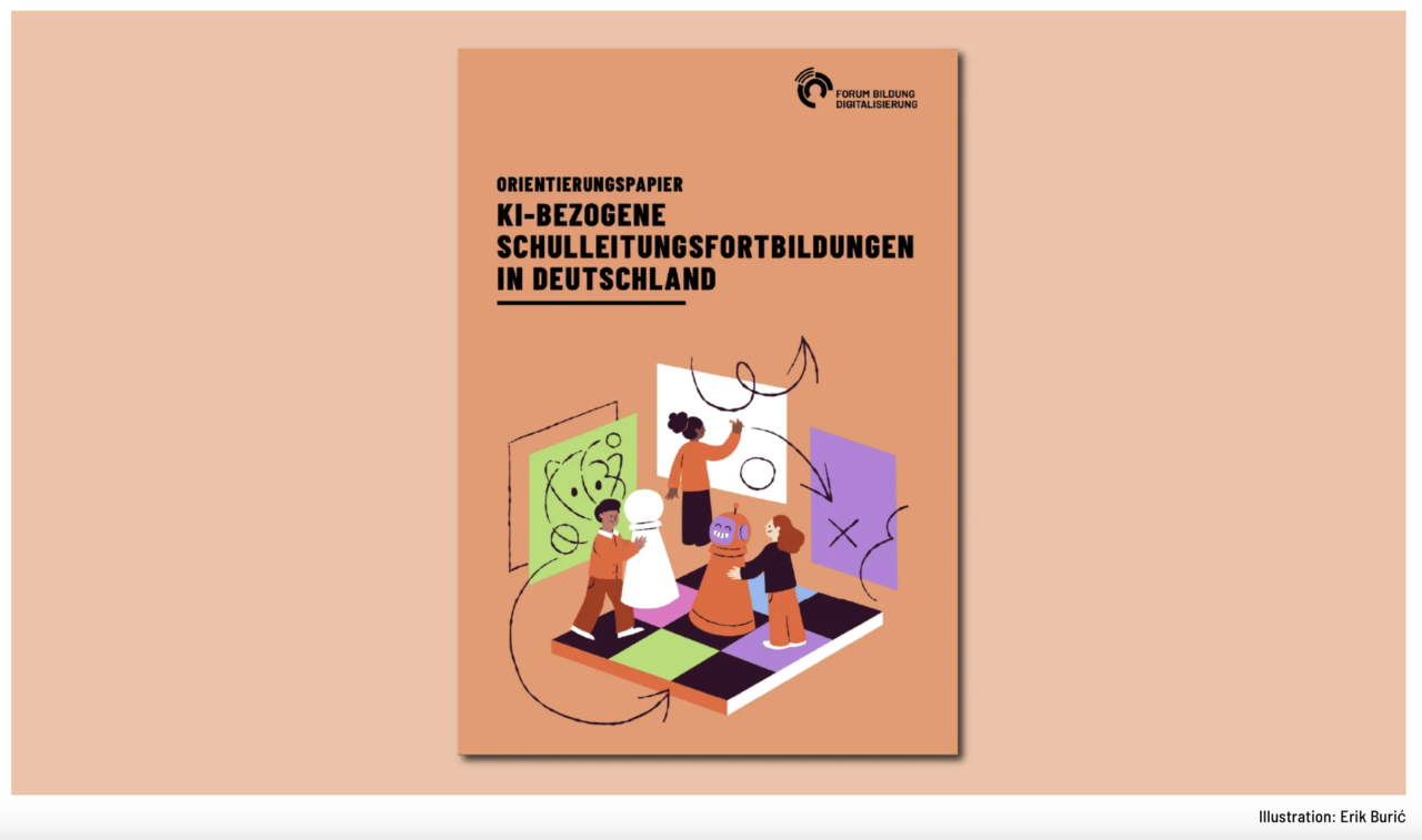 Dazu passt dies, aus einer weiteren Newsletterquelle, vom Forum Bildung Digitalisierung. Denn wie kommt man als Schule soweit wie diese tollen Preisträger? Das Forum BD hat dazu ein Orientierungspapier verfasst, es bietet einen Überblick zu aktuellen KI-Fortbildungsangeboten und ordnet sie hinsichtlich ihrer inhaltlichen Ausrichtung ein. Es analysiert Herausforderungen und Bedarfe in der Gestaltung der Fortbildungen, identifiziert gelungene internationale Praxisbeispiele und leitet Impulse für die Weiterentwicklung von Qualifizierungsangeboten für Schulleitungen und ihre Teams ab. Für die Studie hat ein Autorinnenteam des FIBS – Forschungsinstitut für Bildungs- und Sozialökonomie 41 aktuelle KI-Fortbildungsangebote für Schulleitungen identifiziert und 19 Interviews mit Vertreter:innen von Landesinstituten und privaten Fortbildungsanbietern sowie KI-Expert:innen im In- und Ausland geführt. Angesichts der hohen Dynamik im Feld von KI und Schule stellt diese Untersuchung eine Momentaufnahme der aktuellen Angebote und Entwicklungen dar, von der sich Trends und Impulse für die weitere Entwicklung und Professionalisierung der Fortbildungsangebote ableiten lassen.