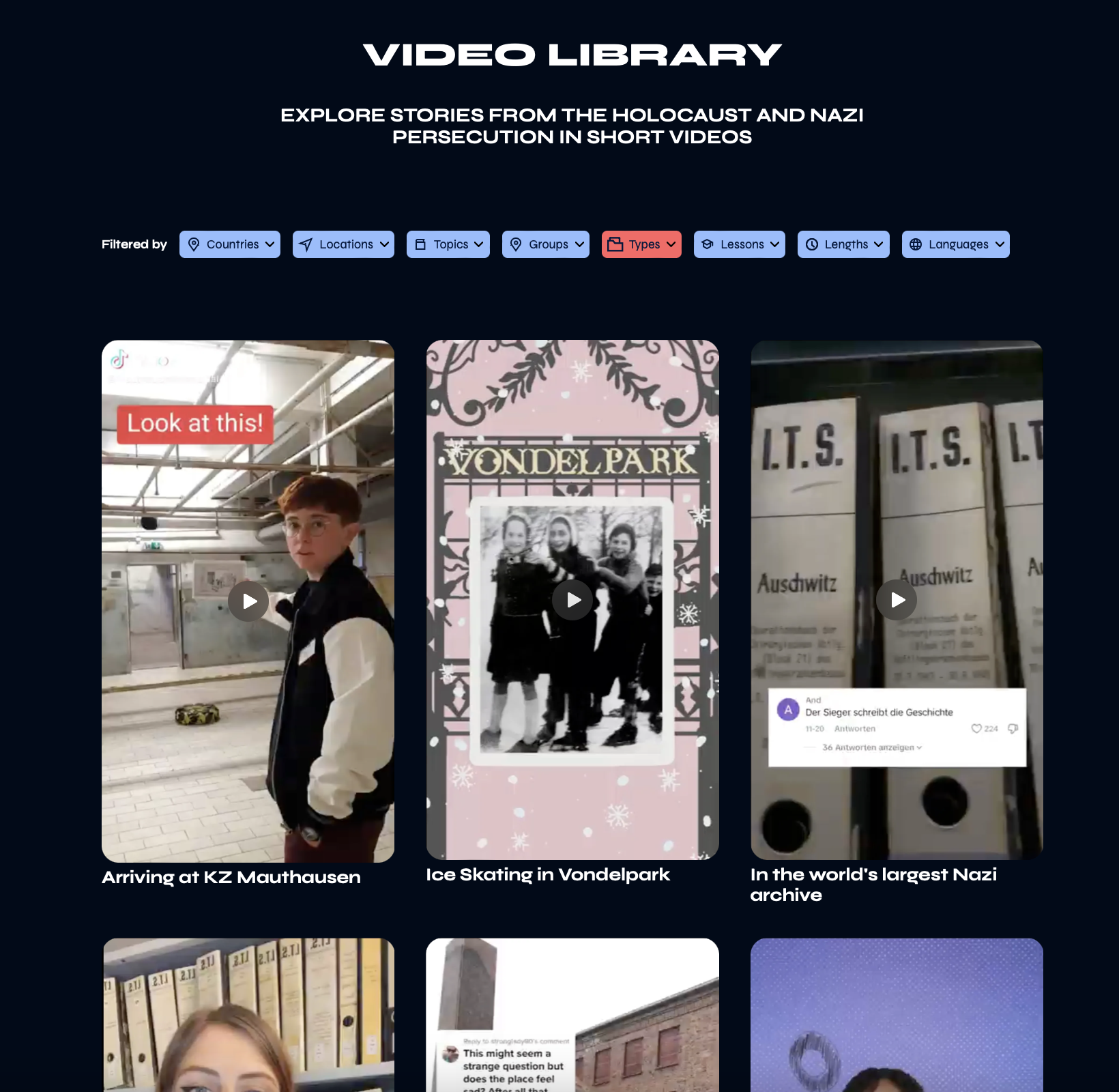 Die vom Anne Frank Zentrum veröffentlichte Bildungsplattform stellt Kurzvideos von mehr als 20 Gedenkstätten, Museen, Bildungseinrichtungen und Zeitzeug/-innen weltweit bereit und ergänzt diese durch pädagogisch aufbereitete Lernmaterialien. Die Kurzvideos thematisieren die Vernichtung der europäischen Jüdinnen und Juden, die Verfolgung durch die Nazis, jüdische Geschichte und Antisemitismus. Anhand von Zeitzeug/-innenberichten, historischen Quellen, Orten und Objekten vermitteln sie verschiedene Themen und Perspektiven im Zusammenhang mit dem Holocaust auf anschauliche Weise.
